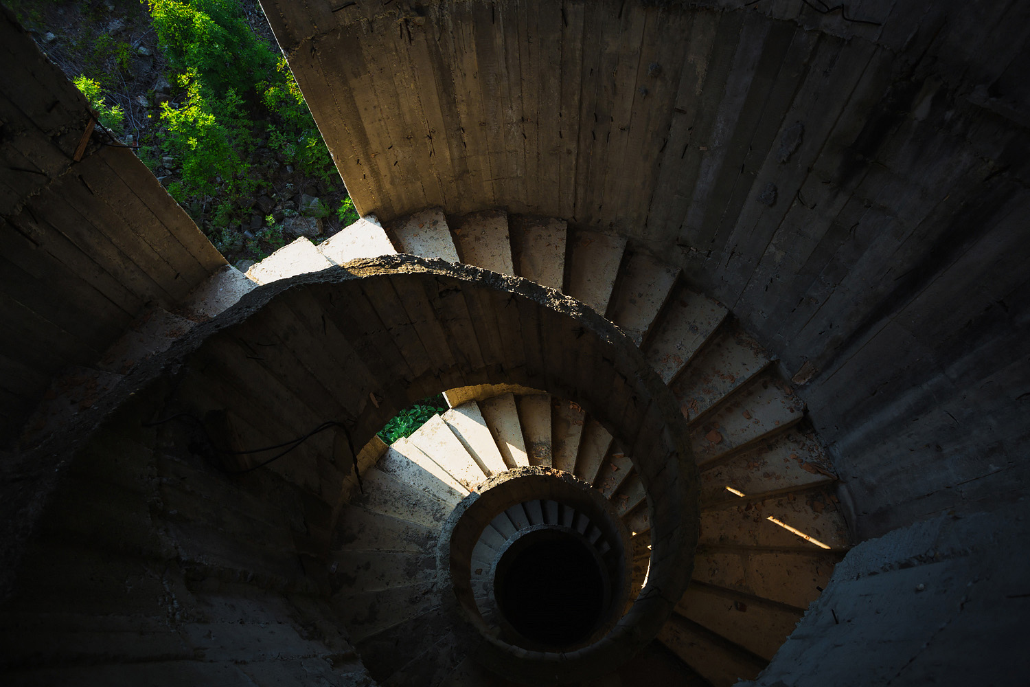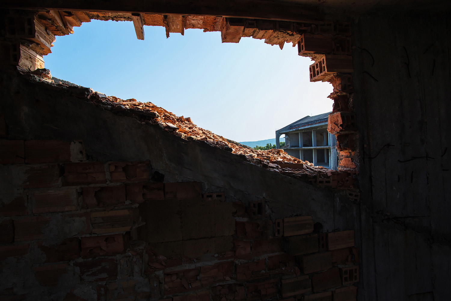 Така изглеждаше първият исполин отпредЛесно се озовах вътре, където веднага се появиха графитите и разните артефакти – единствените обитатели на призрачният комплексЗакъде без меката соц-врата…Признаци на поне някакъв вид “живот”Едно от големите помещения тъне в руиниВъпреки окаяното и незавършеното си състояние, витата стълба изглежда наистина впечатляващоА погледът нагоре също е уникаленС изглед към Черно море!Витата стълба ме отведе нагоре по етажитеНагоре небосвод, надолу безднаИзглед към плажа през уникално оформените прозорциЕдна от другите зали, където червеният (по дизайн или по принуда) таван напълно допада на ретро соц атмосфератаЕдна от няколко различни дати (всички през 1989-та година), която видях, най-вероятно издълбани от работници в последните дни преди замразяването на строежаКакво ли е щяло да бъде предназначението на всички тези огромни, отворени пространства…Мъртвите железа на недовършената конструкция контрастират с живата природа в заден планТова явно е било “сцената”Поглед наляво от горния етаж на сценатаИ поглед надолу, където сега цари само хаос и разрухаЧаст от другите сгради, през погледа на една от техните изтърбушени и изоставени сестриИзглед от покрива. Може би това е трябвало да бъде последният етаж, но той никога не е бил завършен напълно.Патриотични графитиИ един изглед към целия комплексЕдин от прозорците на последният етаж поставя рамка около пейзажа на Аркутинският плаж Още една гибелна датаВитата стълба погледната отгоре надолу. Трябваше да внимавам да не се изсипя през зеещите дупки в стената, докато се катерех нагоре. Предполагам, че там са трябвало да бъдат поставени прозорци.Зеещи ями всякакви….